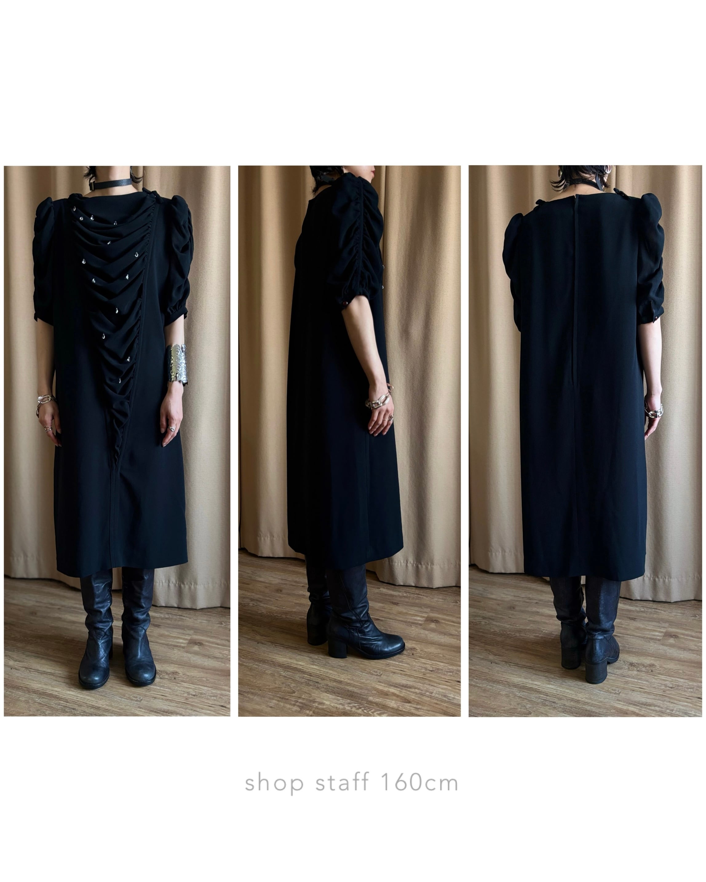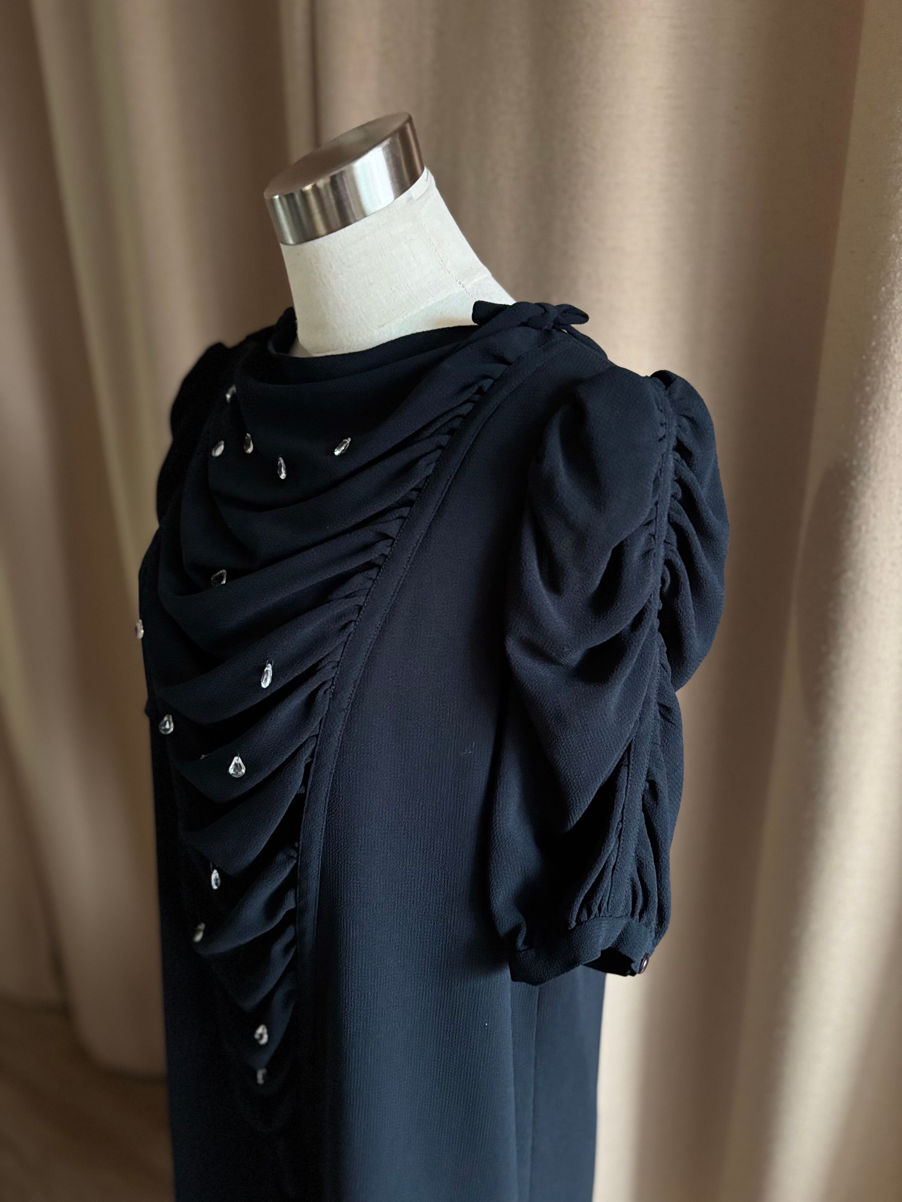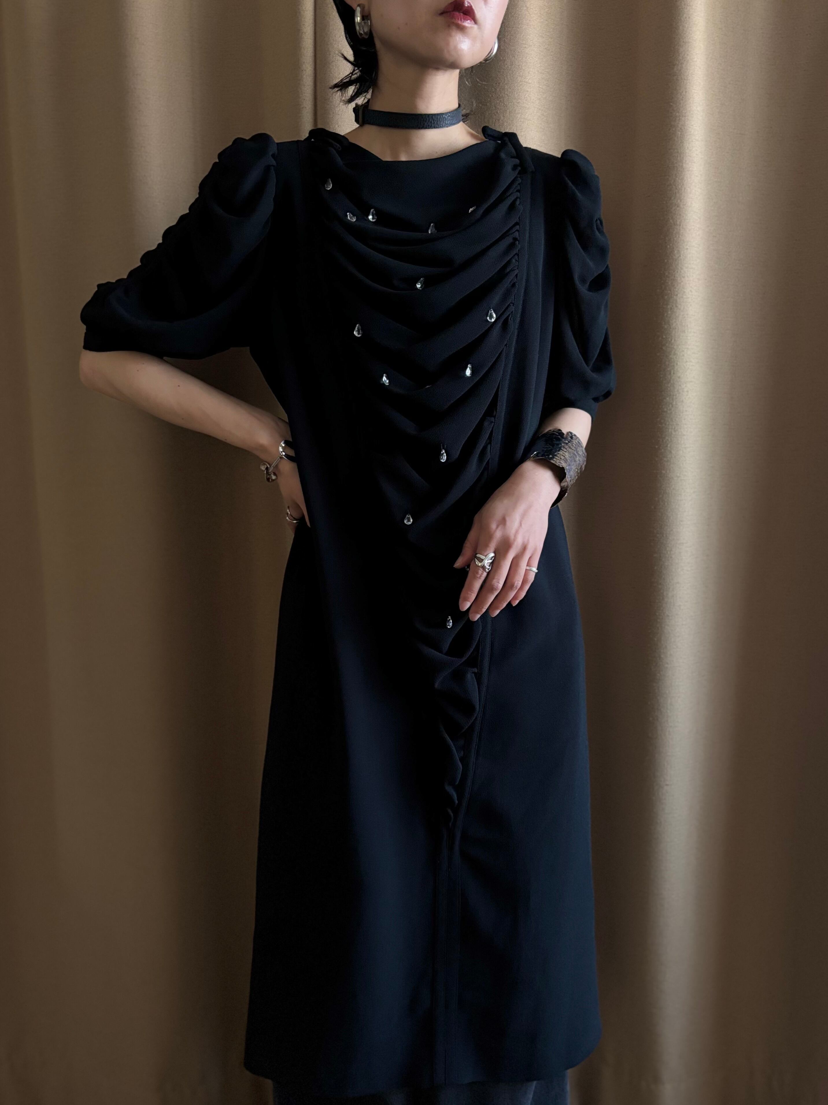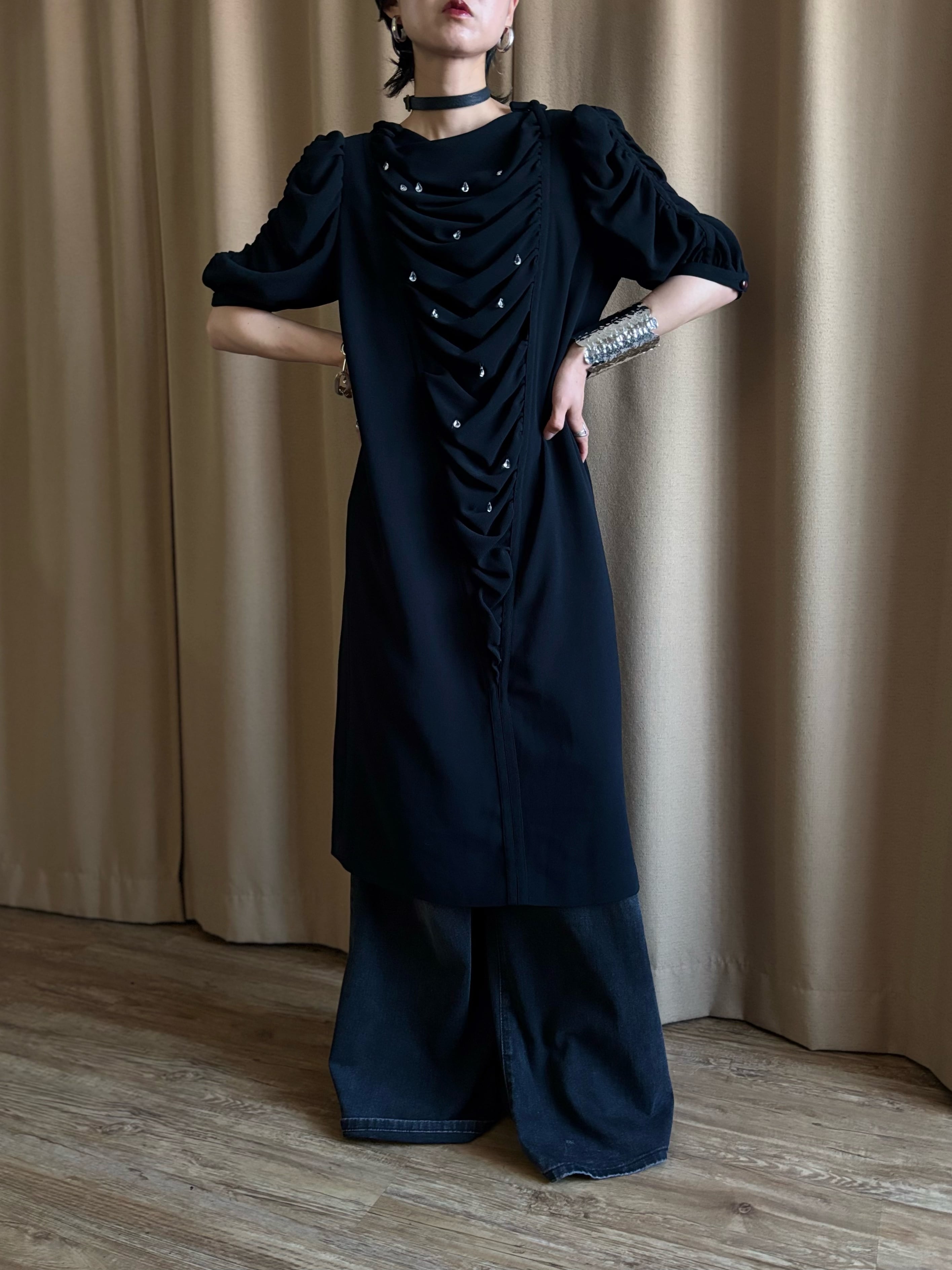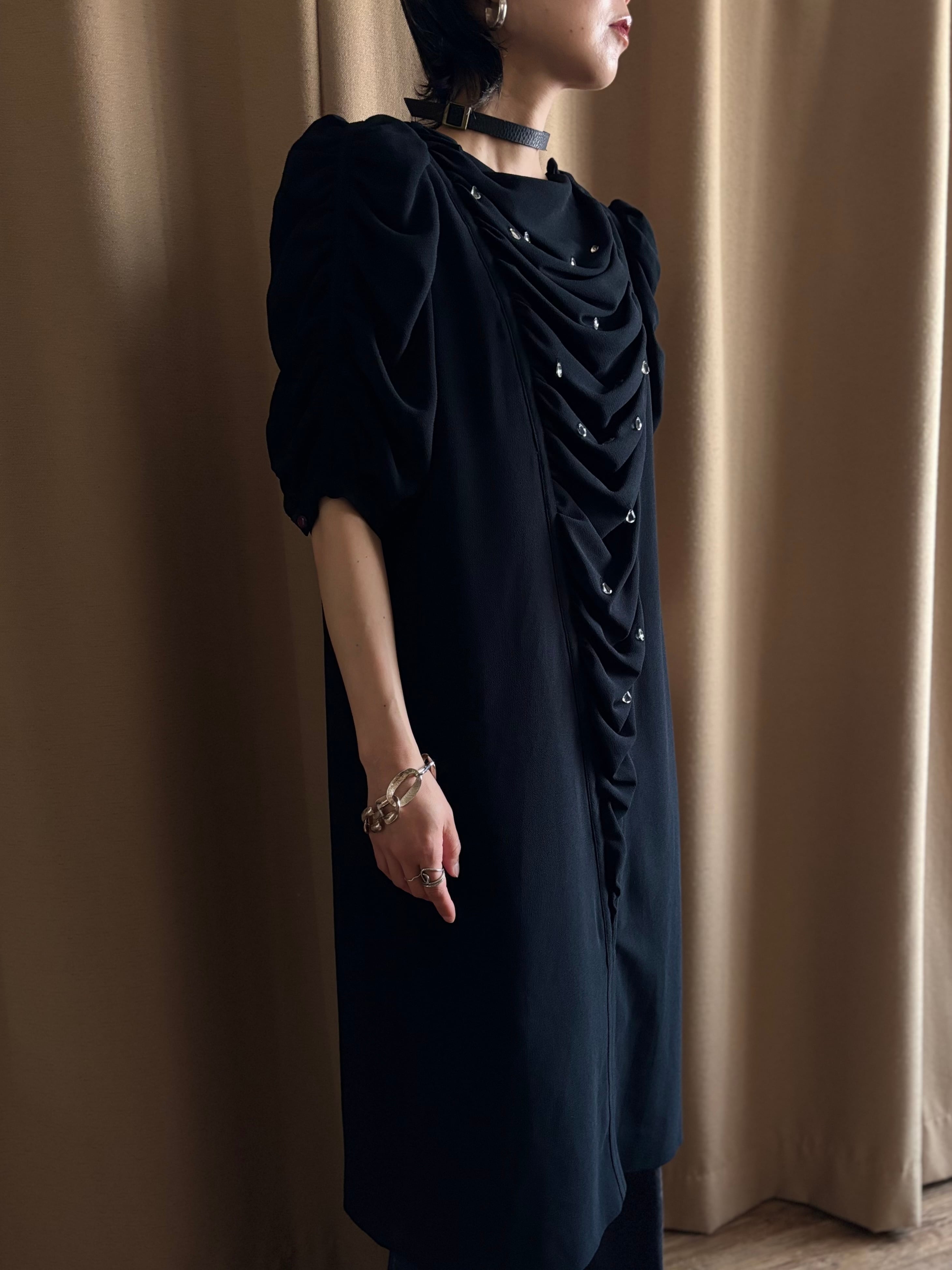 立体的に重なるドレープとパワーショルダーが、モードで洗練されたシルエットを演出。