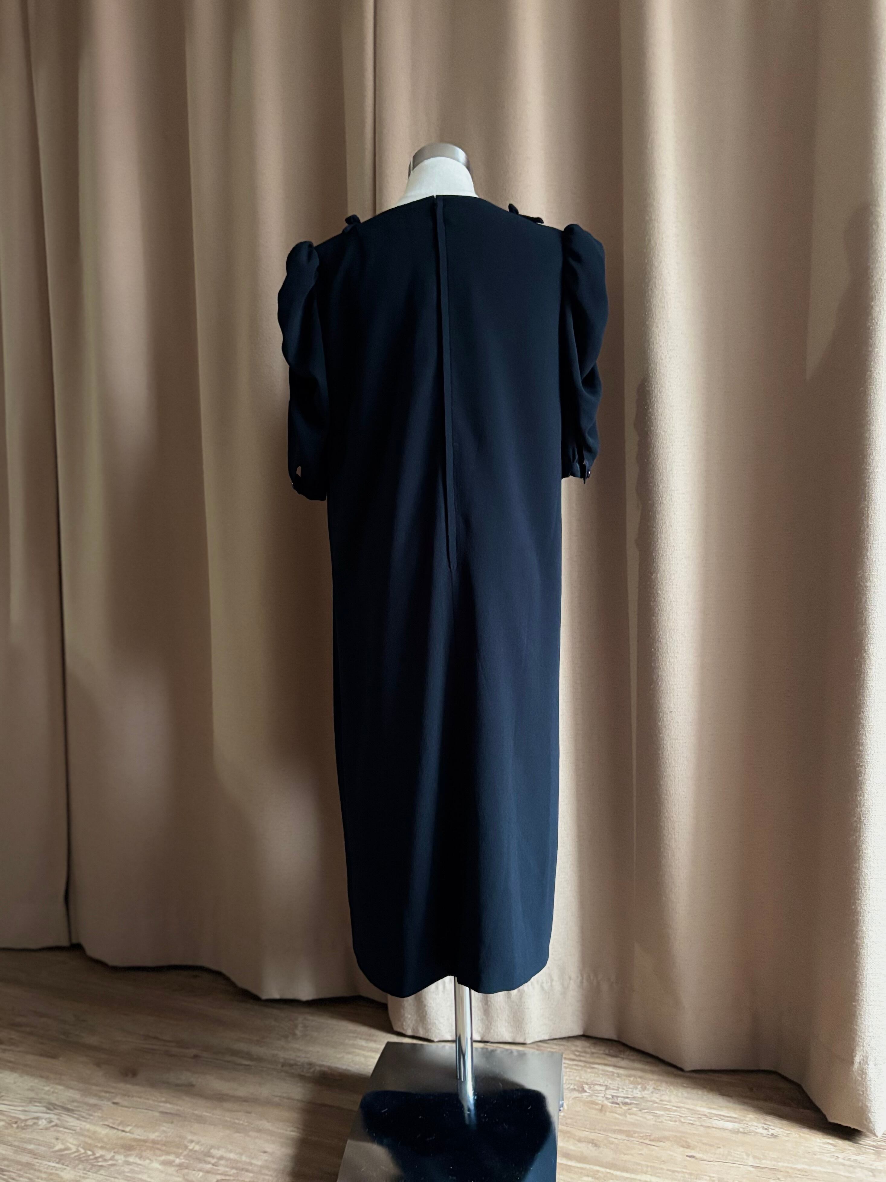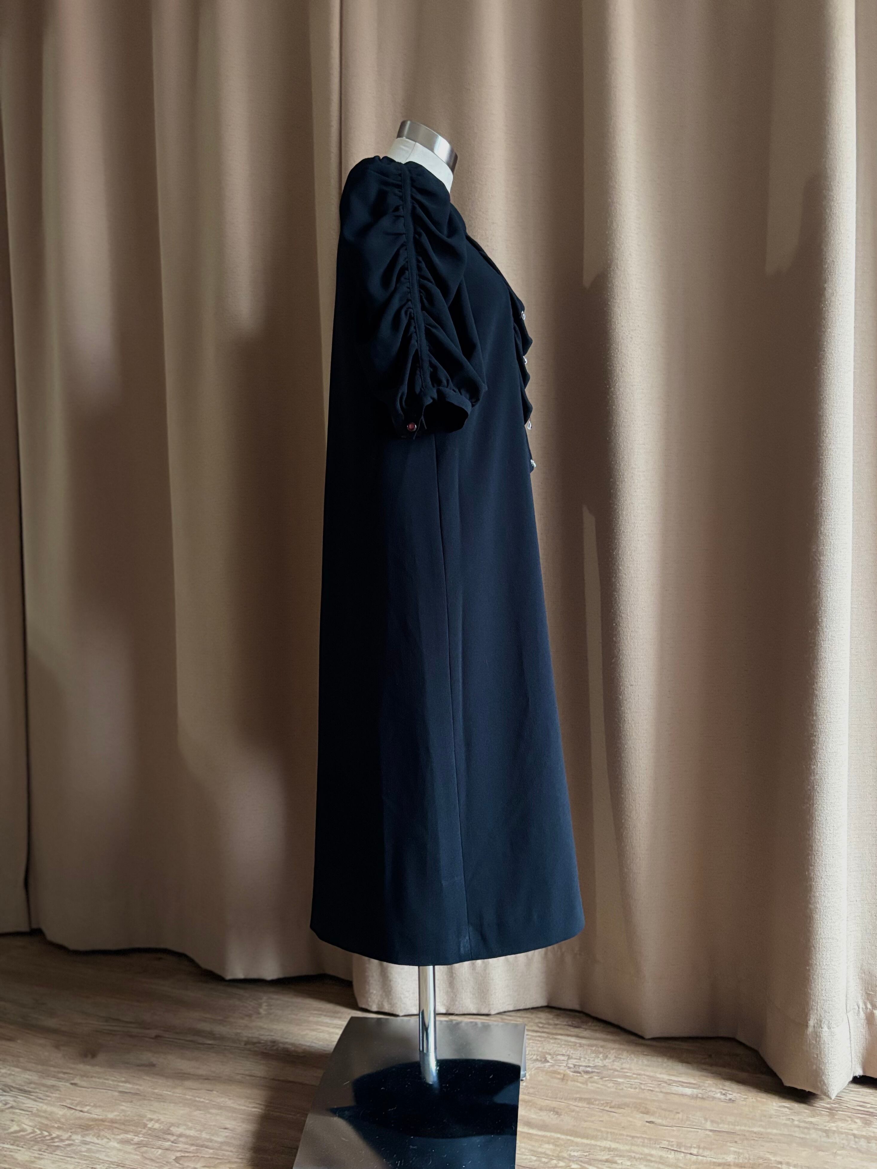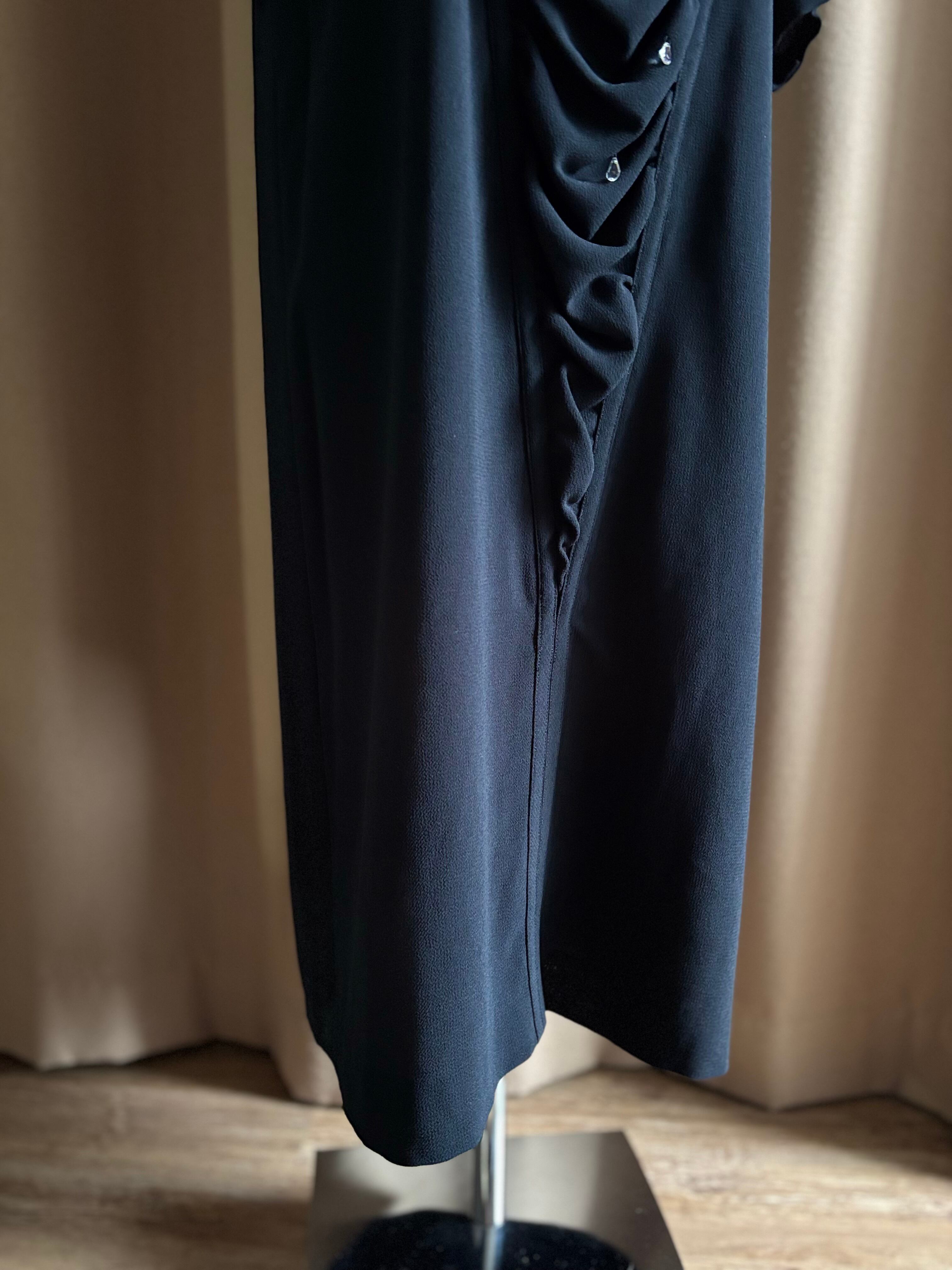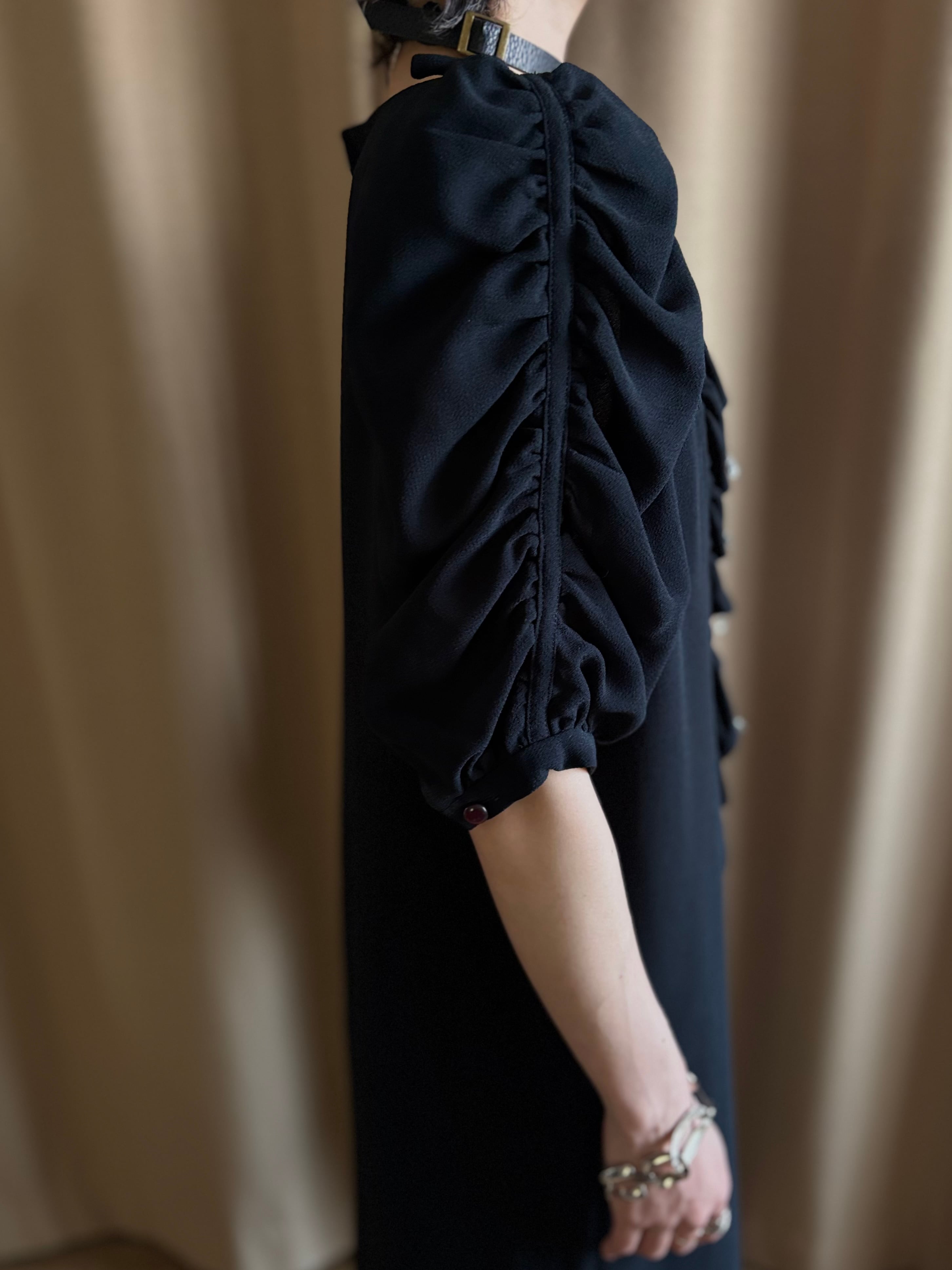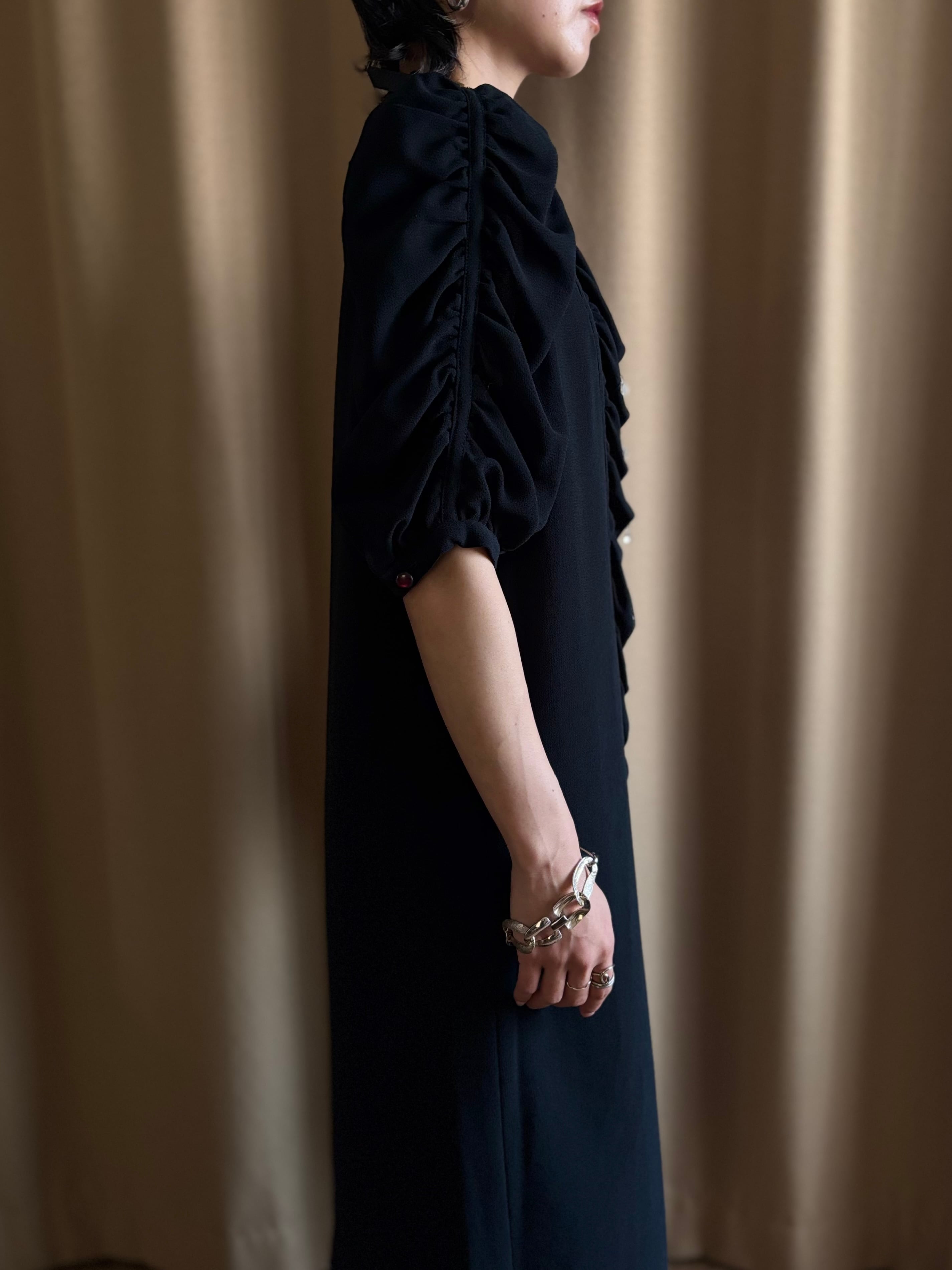 立体的に重なるドレープとパワーショルダーが、モードで洗練されたシルエットを演出。