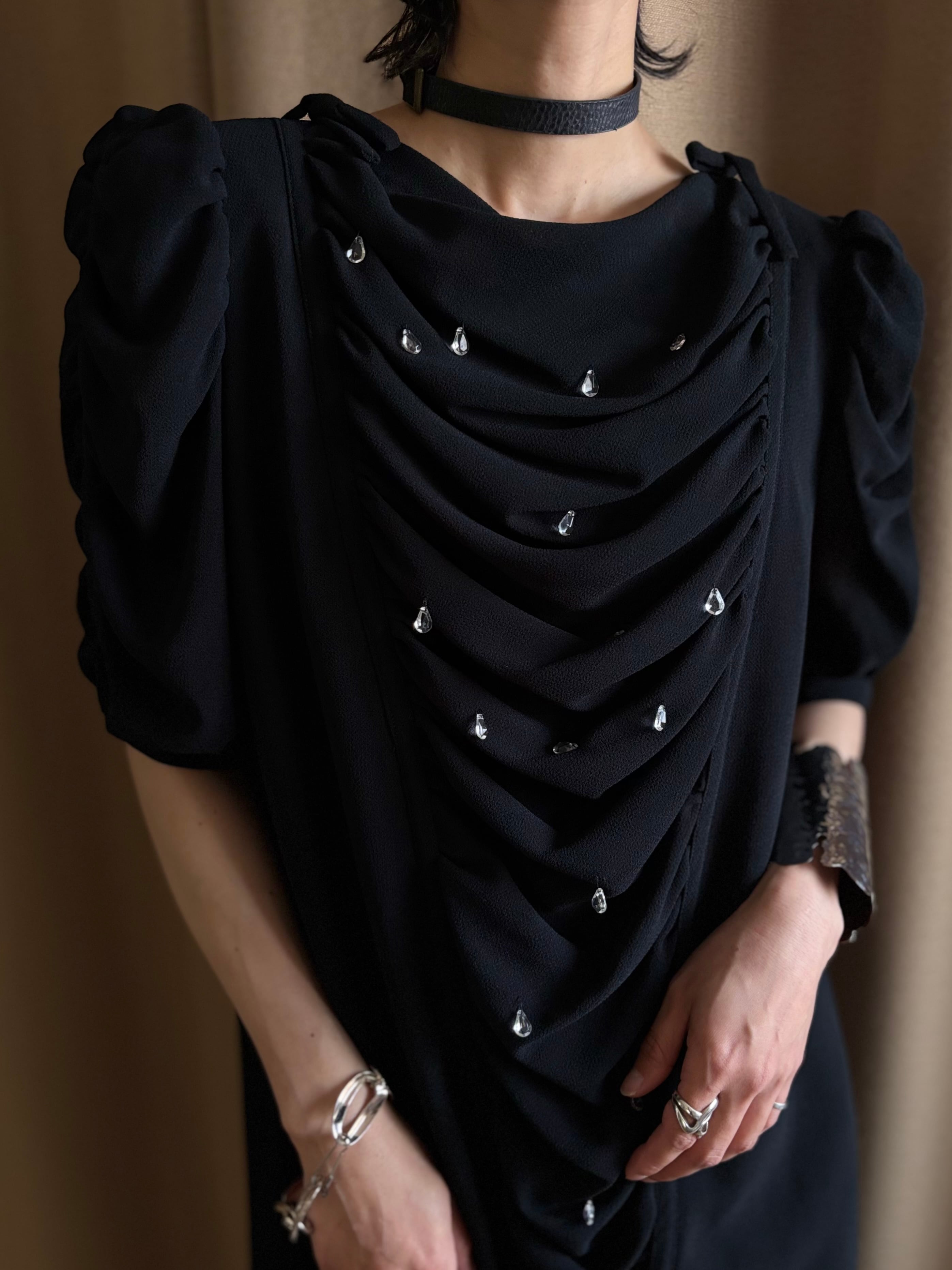 胸元にあしらわれたしずく型のラインストーンが、さりげなくラグジュアリーな輝きを添えます。